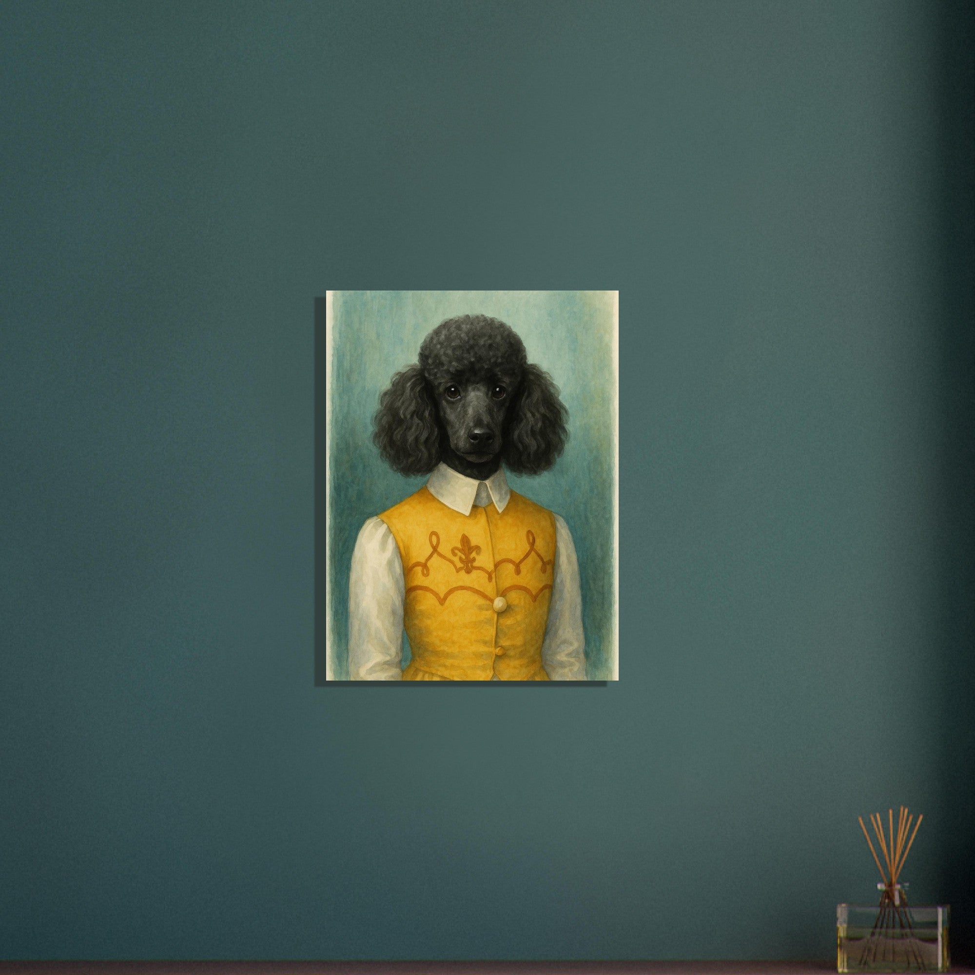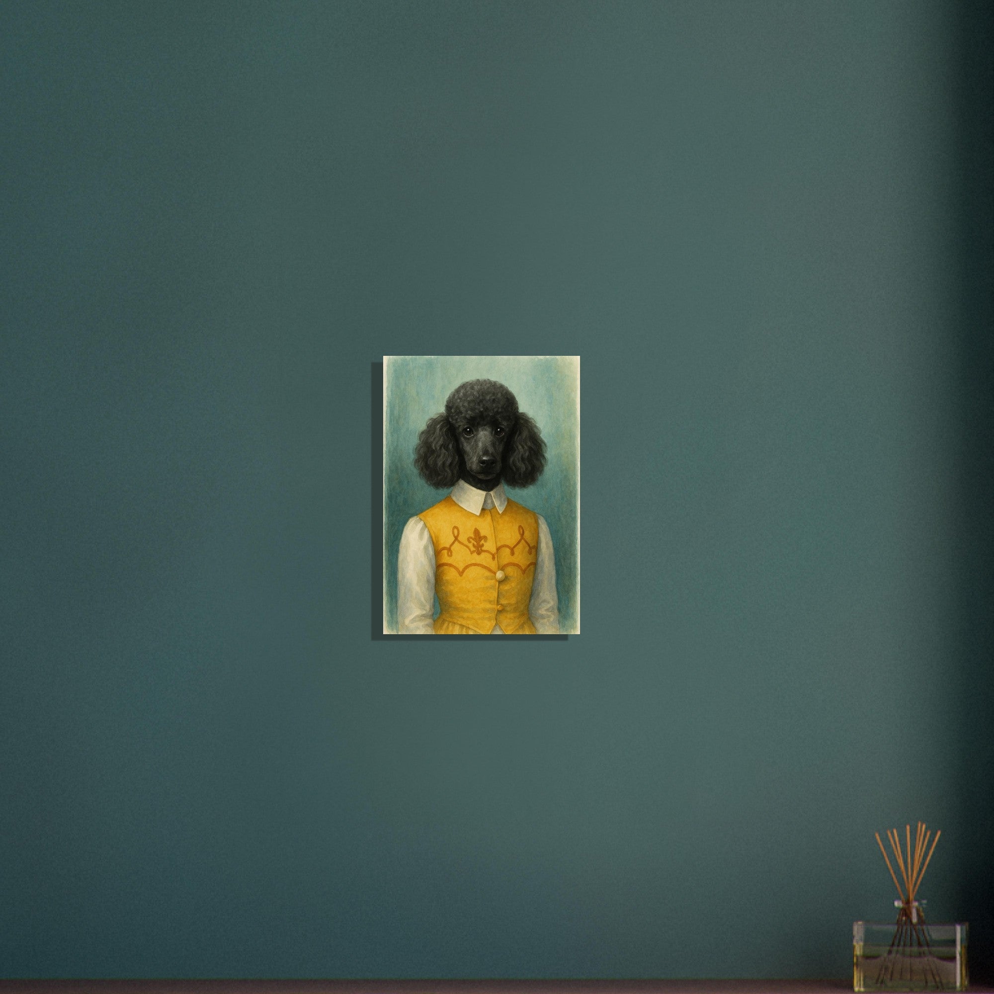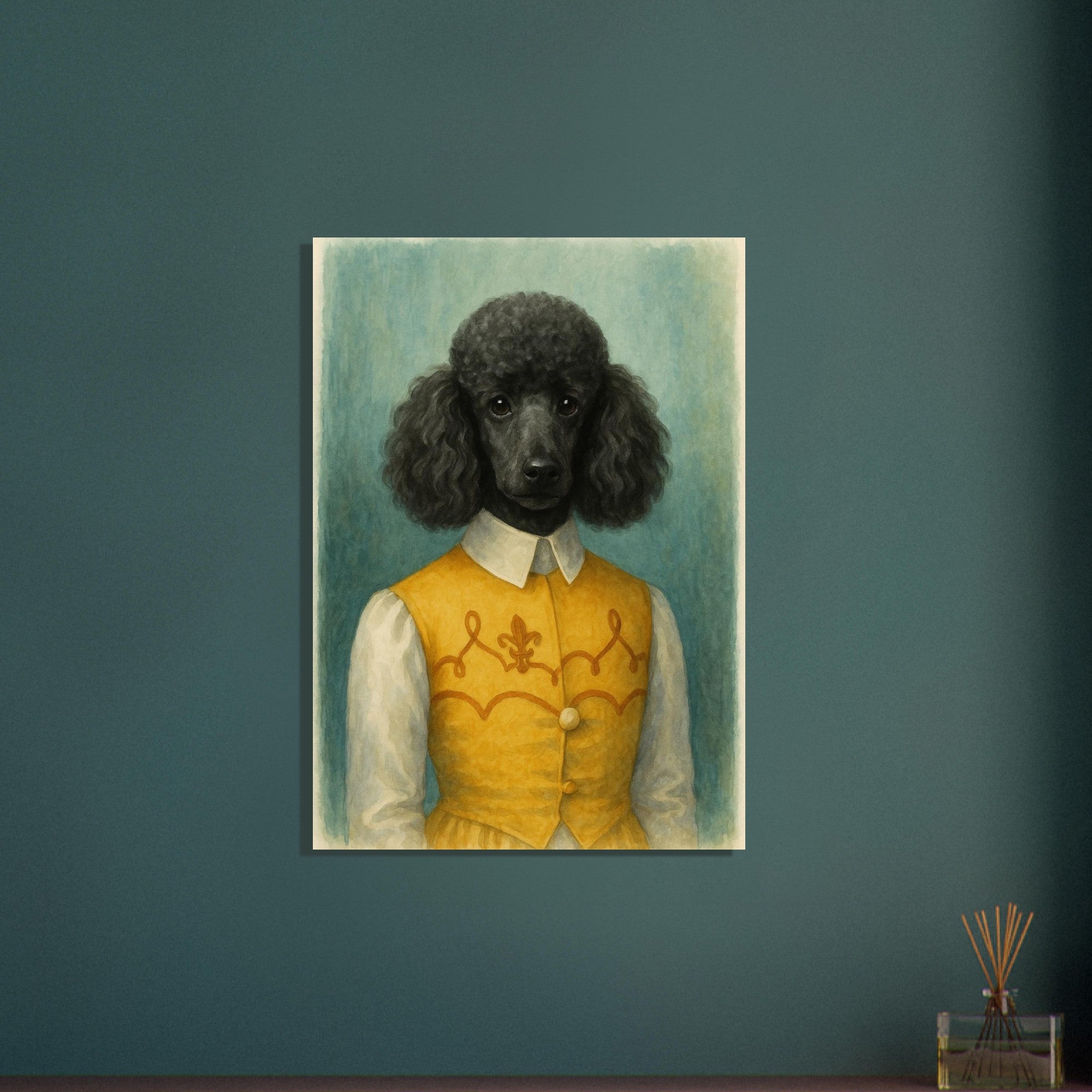 Noble Nuzzles brings refined charm into your home. Featuring a black poodle in a golden embroidered vest, this watercolor-style portrait radiates elegance and personality. Ideal for dog lovers with a taste for humor and class. Makes a beautiful addition to traditional or country interiors. Printed on smooth, high-quality matte paper. Sizes Available: A1, A2, A3, A4 Paper Type: Matte finish 🖨️ Product Features: Watercolor-style illustration A1, A2, A3, A4, A5 and other common sizes Museum-quality matte finish Vivid, true-to-tone pigment reproduction Key Features: - **Material:** Printed on lightweight, uncoated classic matte paper that ensures durability and longevity. - **Paper Finishing:** The matte, smooth, and non-reflective surface delivers a luxurious finish, ideal for displaying in any lighting. - **Paper Weight:** Sturdy weight of 170 gsm (65 lb) with a thickness of 0.19 mm (7.5 mils). - **Sustainable:** Crafted from environmentally responsible FSC-certified paper. - **Sizes Available:** Choose from 29 sizes in inches (US & CA) or centimeters (for the rest of the world). 🎁 Great For: Art collectors Interior design lovers Gifts for creatives Contemporary decor seekers 🧵 Style Keywords: Watercolor | Abstract | Textured | Expressionist | Minimal | Organic | Earthy | Modern | Vertical Art 🖼️ Style Suggestions: Pair with natural wood or metal frames Hang in sets with other pattern prints Ideal for minimalist, wabi-sabi, or earthy interior palettes 🏷️ 13 Tags: poodle print, black poodle art, watercolor dog portrait, elegant pet painting, dog in costume, anthropomorphic poodle, vintage pet art, classic dog wall decor, stylish dog print, golden vest poodle, dog lover gift, French poodle artwork, humorous pet print
