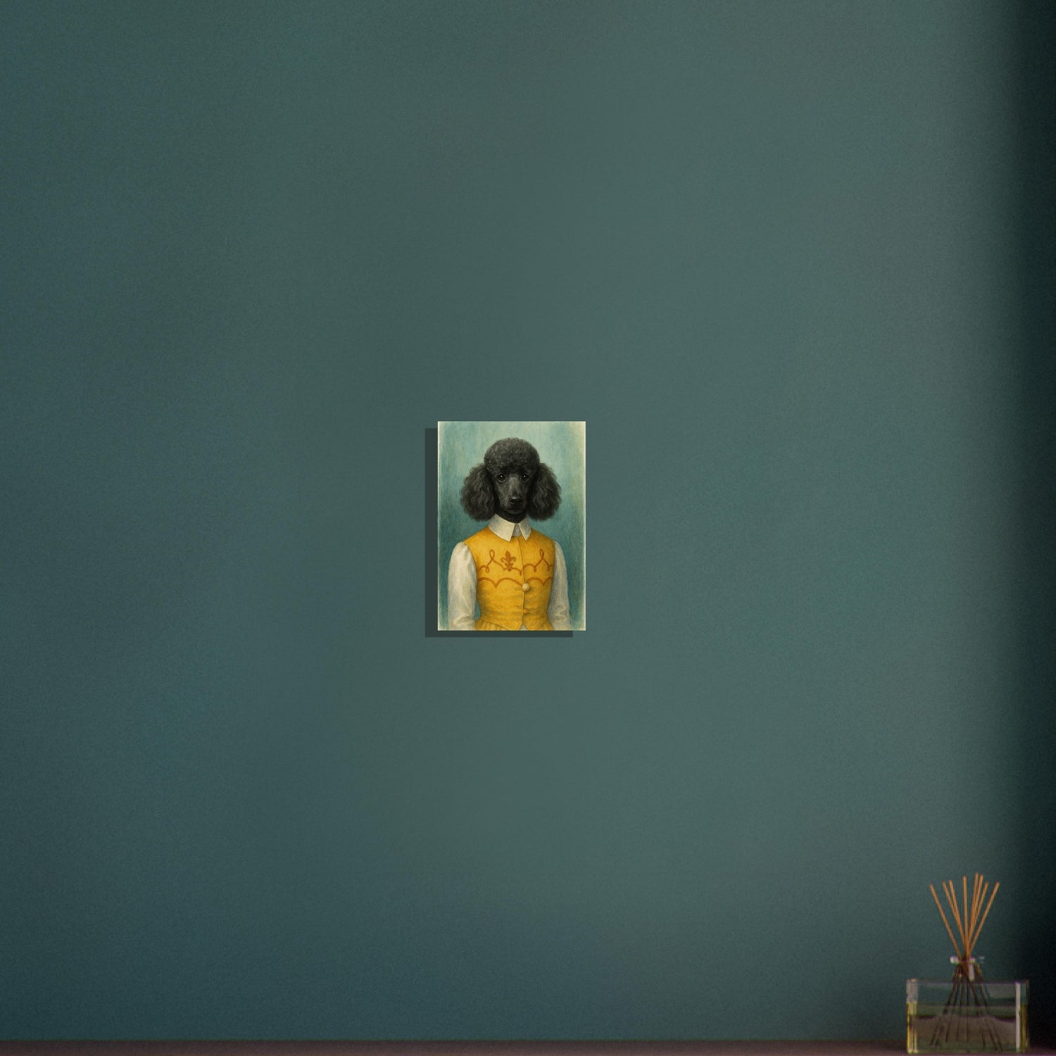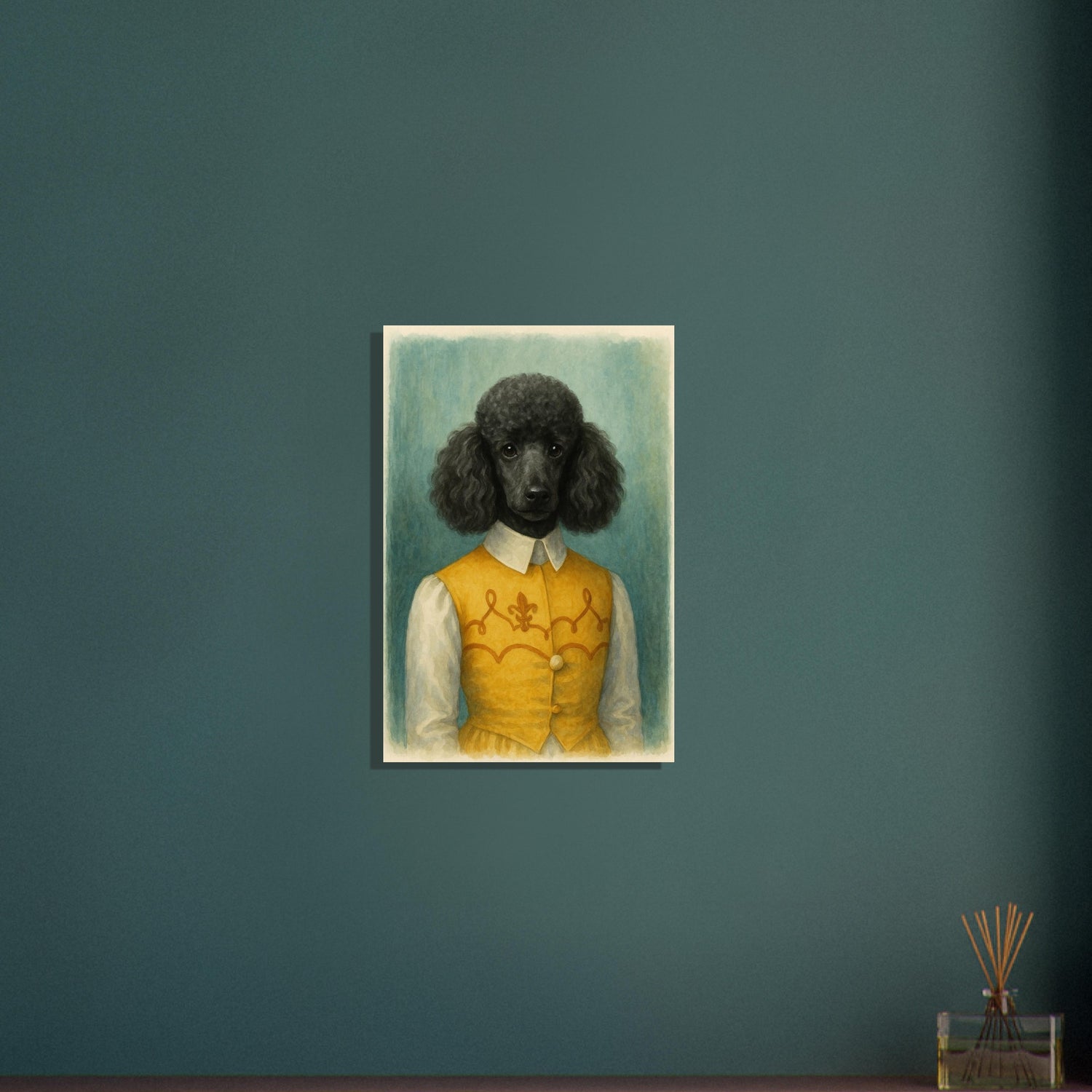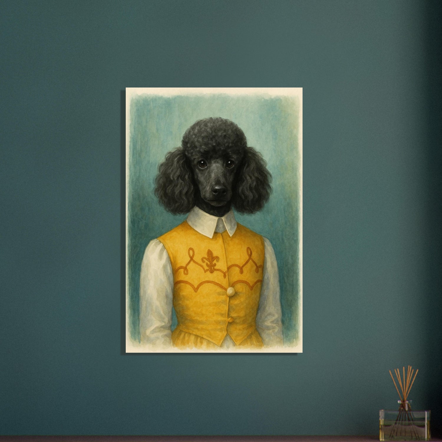 Noble Nuzzles brings refined charm into your home. Featuring a black poodle in a golden embroidered vest, this watercolor-style portrait radiates elegance and personality. Ideal for dog lovers with a taste for humor and class. Makes a beautiful addition to traditional or country interiors. Printed on smooth, high-quality matte paper. Sizes Available: A1, A2, A3, A4 Paper Type: Matte finish 🖨️ Product Features: Watercolor-style illustration A1, A2, A3, A4, A5 and other common sizes Museum-quality matte finish Vivid, true-to-tone pigment reproduction Key Features: - **Material:** Printed on lightweight, uncoated classic matte paper that ensures durability and longevity. - **Paper Finishing:** The matte, smooth, and non-reflective surface delivers a luxurious finish, ideal for displaying in any lighting. - **Paper Weight:** Sturdy weight of 170 gsm (65 lb) with a thickness of 0.19 mm (7.5 mils). - **Sustainable:** Crafted from environmentally responsible FSC-certified paper. - **Sizes Available:** Choose from 29 sizes in inches (US & CA) or centimeters (for the rest of the world). 🎁 Great For: Art collectors Interior design lovers Gifts for creatives Contemporary decor seekers 🧵 Style Keywords: Watercolor | Abstract | Textured | Expressionist | Minimal | Organic | Earthy | Modern | Vertical Art 🖼️ Style Suggestions: Pair with natural wood or metal frames Hang in sets with other pattern prints Ideal for minimalist, wabi-sabi, or earthy interior palettes 🏷️ 13 Tags: poodle print, black poodle art, watercolor dog portrait, elegant pet painting, dog in costume, anthropomorphic poodle, vintage pet art, classic dog wall decor, stylish dog print, golden vest poodle, dog lover gift, French poodle artwork, humorous pet print