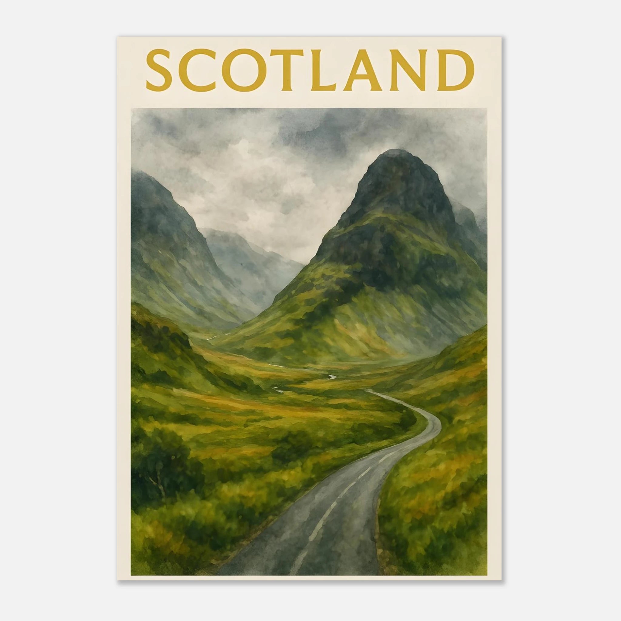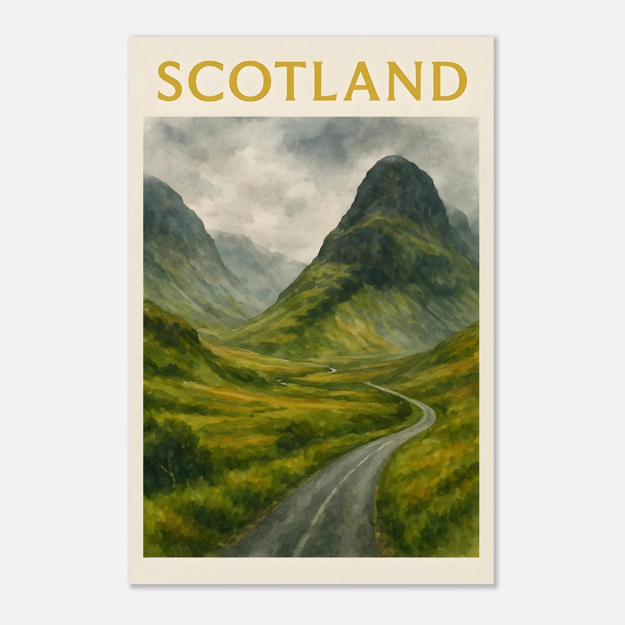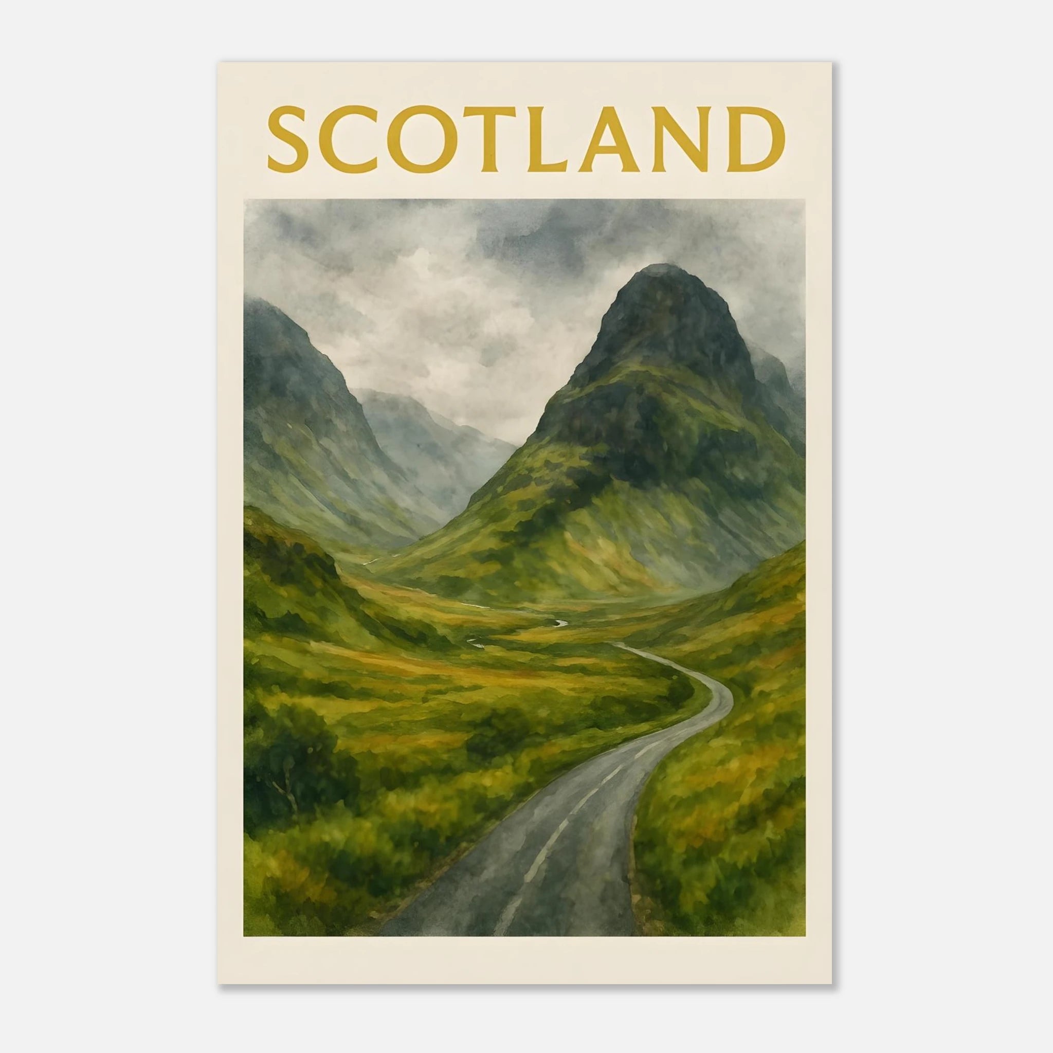 Bring the wild beauty of the Scottish Highlands into your space with this Glencoe watercolor poster. Featuring a winding road through a lush green valley framed by towering misty mountains, this A4 print evokes the raw, dramatic charm of Scotland’s most iconic landscape. Perfect for nature lovers, travel enthusiasts, or anyone seeking serene wall art with depth and atmosphere. This unframed art print is ideal for home offices, living rooms, or gift-giving to lovers of Scotland and outdoor adventure. 🎁 Perfect For: - Scottish landscape lovers - Cozy, travel-inspired home decor - Thoughtful gifts for adventurers or train spotters We also sell digital version of these in separate listing. Please see our shop. Please Note: 🎨 This listing is for the PRINT ONLY. Frames are NOT included. 🎨 Key Features: - **Material**: Durable, 170 gsm (65 lb) matte paper with a smooth, non-reflective finish that enhances its aesthetic appeal. - **Sustainable Choice**: Our paper is FSC-certified, promoting responsible forest management and sustainability. - **Perfect Fit**: Available in 29 sizes in inches (for the US & CA) and centimeters (for the rest of the world) to fit any wall perfectly. - **Versatile Decor**: Whether for a nursery, playroom, or a cozy reading nook, this poster infuses charm and positivity to any space. Tags Glencoe poster, Scotland wall art, Scottish landscape, Highlands decor, misty mountains, travel poster, watercolor print, mountain art, nature wall decor, A4 print, UK travel art, green valley, road trip art