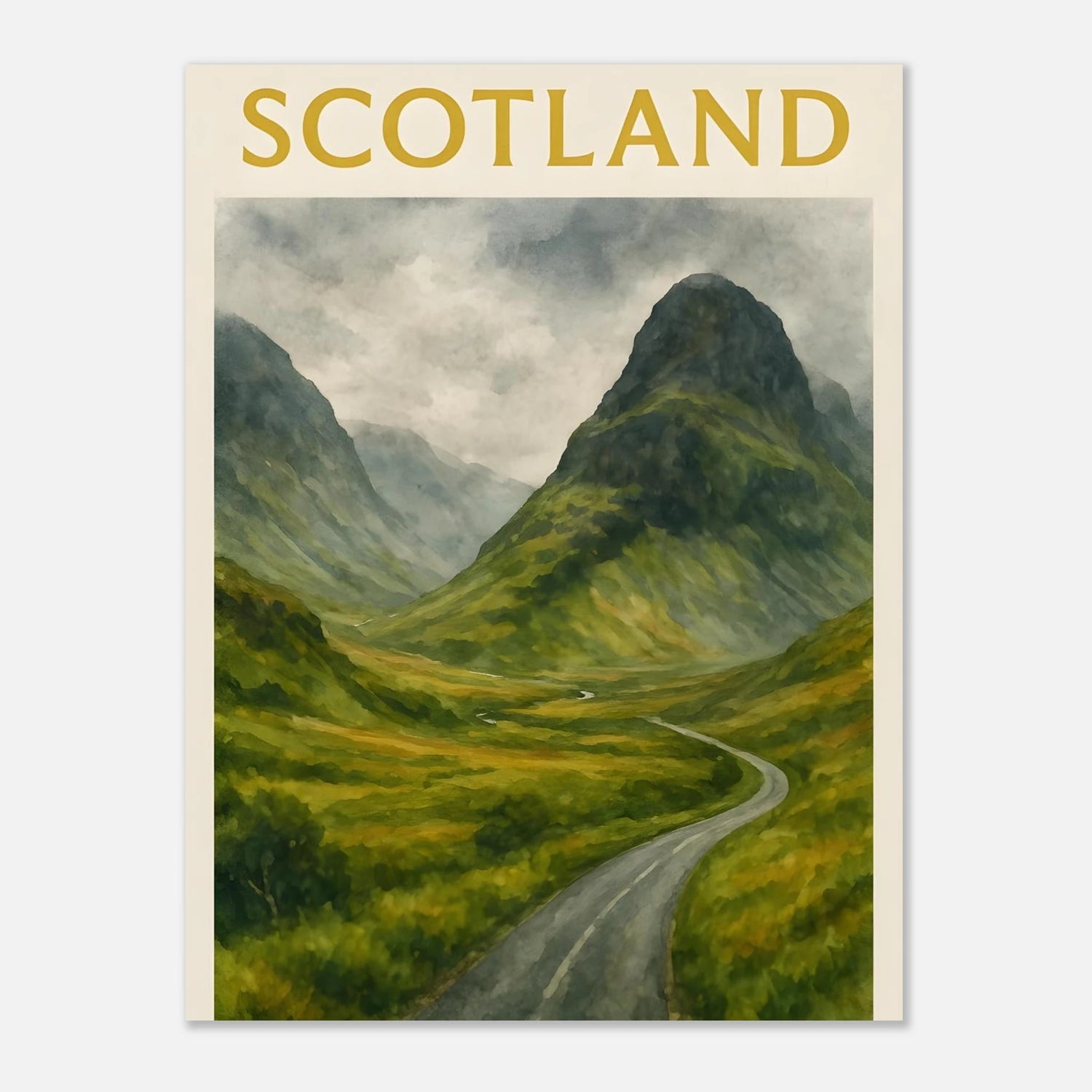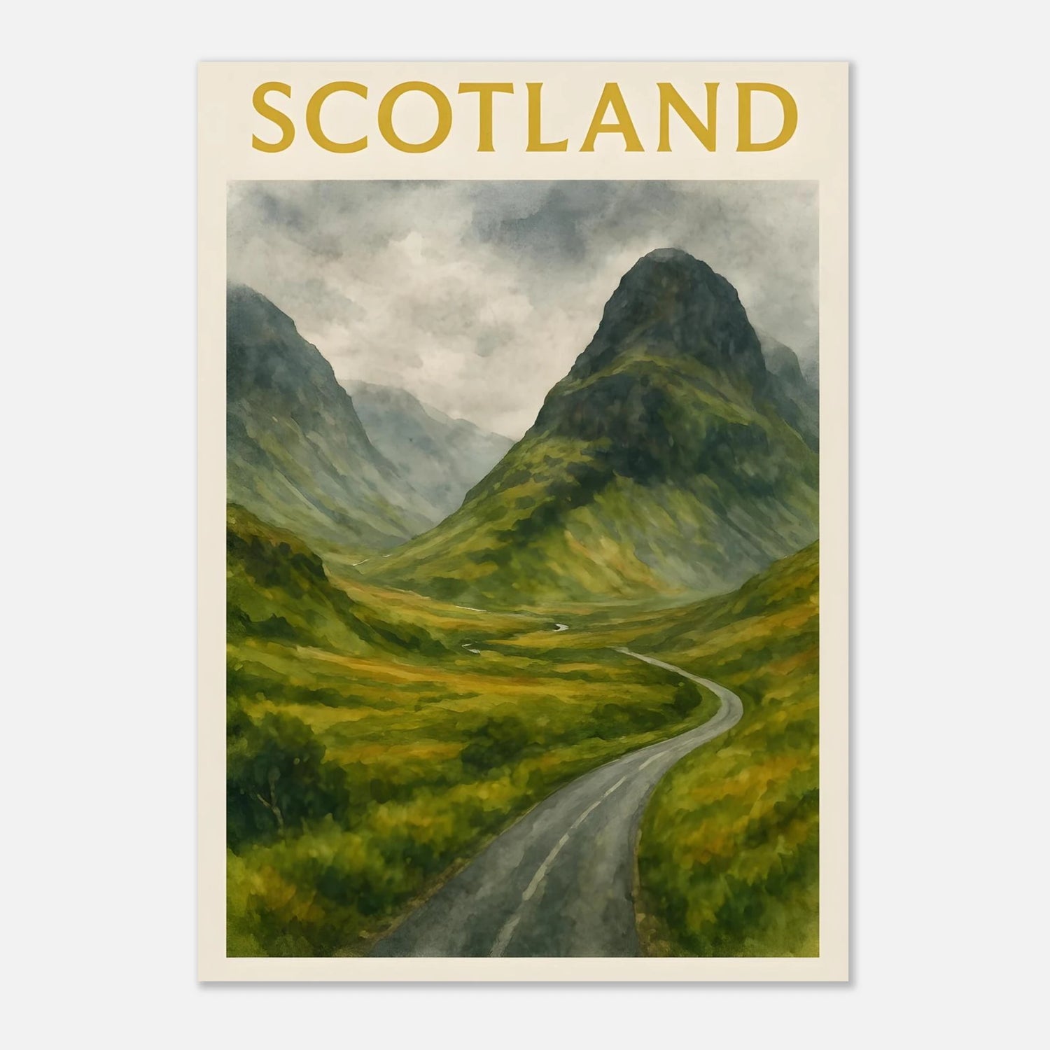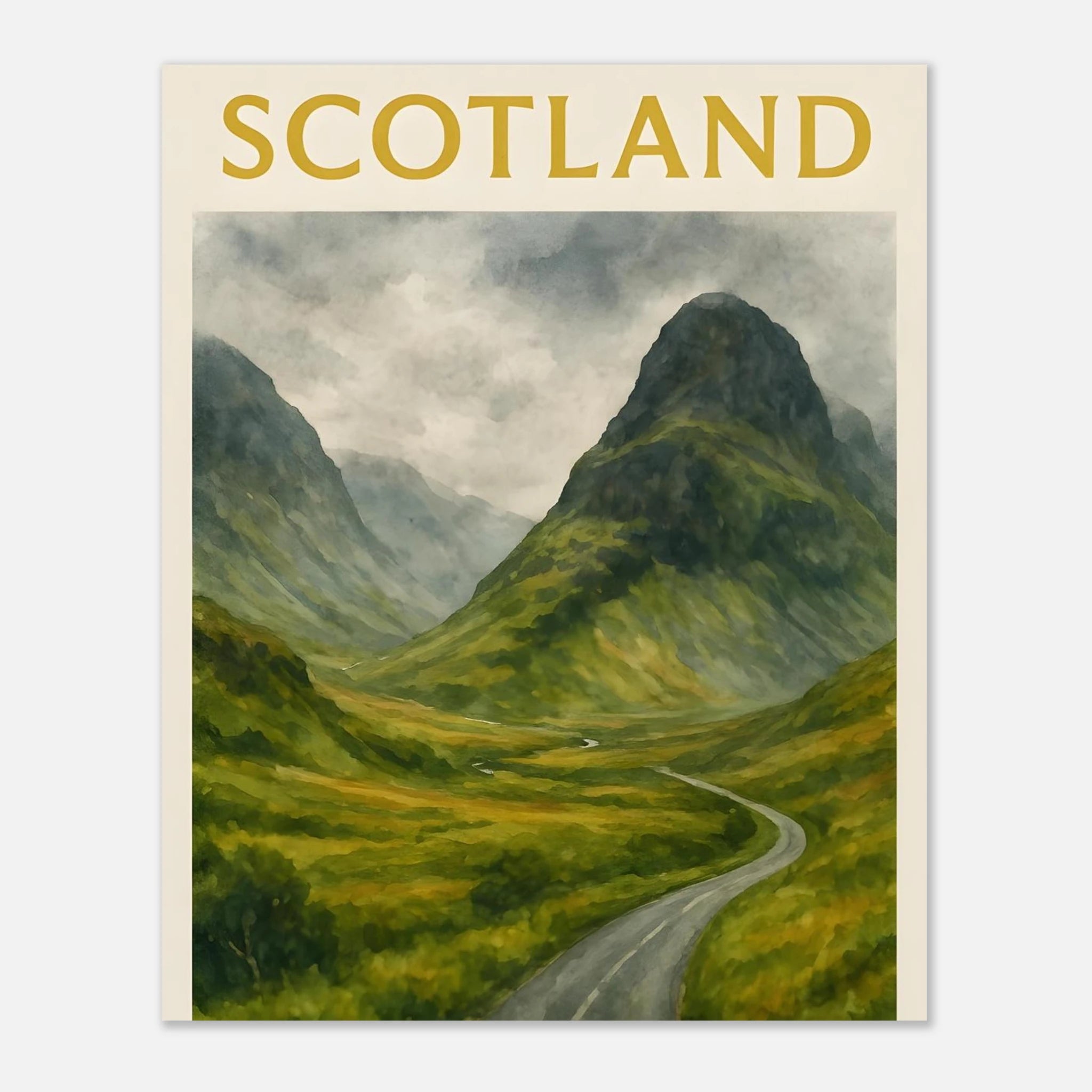 Bring the wild beauty of the Scottish Highlands into your space with this Glencoe watercolor poster. Featuring a winding road through a lush green valley framed by towering misty mountains, this A4 print evokes the raw, dramatic charm of Scotland’s most iconic landscape. Perfect for nature lovers, travel enthusiasts, or anyone seeking serene wall art with depth and atmosphere. This unframed art print is ideal for home offices, living rooms, or gift-giving to lovers of Scotland and outdoor adventure. 🎁 Perfect For: - Scottish landscape lovers - Cozy, travel-inspired home decor - Thoughtful gifts for adventurers or train spotters We also sell digital version of these in separate listing. Please see our shop. Please Note: 🎨 This listing is for the PRINT ONLY. Frames are NOT included. 🎨 Key Features: - **Material**: Durable, 170 gsm (65 lb) matte paper with a smooth, non-reflective finish that enhances its aesthetic appeal. - **Sustainable Choice**: Our paper is FSC-certified, promoting responsible forest management and sustainability. - **Perfect Fit**: Available in 29 sizes in inches (for the US & CA) and centimeters (for the rest of the world) to fit any wall perfectly. - **Versatile Decor**: Whether for a nursery, playroom, or a cozy reading nook, this poster infuses charm and positivity to any space. Tags Glencoe poster, Scotland wall art, Scottish landscape, Highlands decor, misty mountains, travel poster, watercolor print, mountain art, nature wall decor, A4 print, UK travel art, green valley, road trip art
